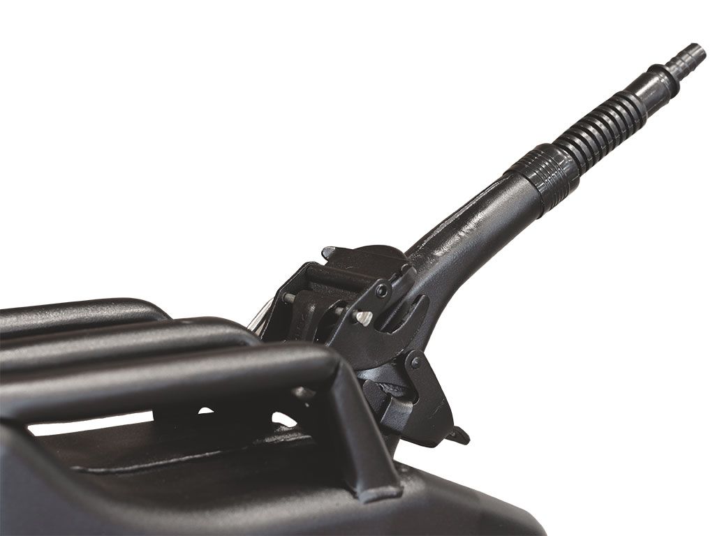 A metal spout with a rubber nozzle that fits onto the Front Runner 20L Jerry Can.