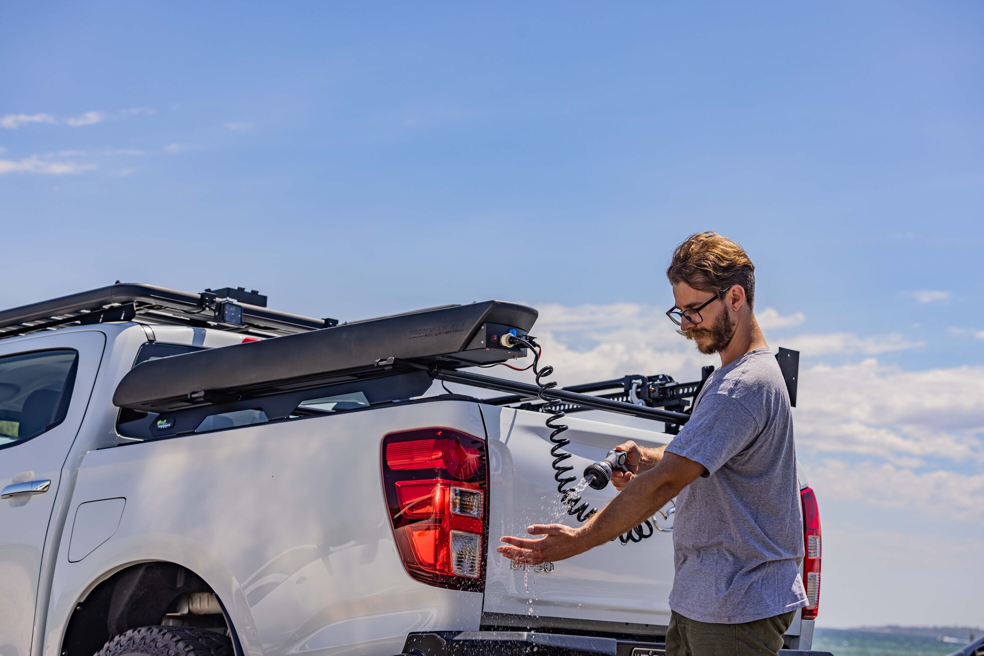 You might have a few litres of water in a container, or access to a sand covered outdoor shower, but it doesn’t give you the satisfying ease that a personal hose or tap provides. That’s where the new Ironman 4×4 30L Water Tank comes in.