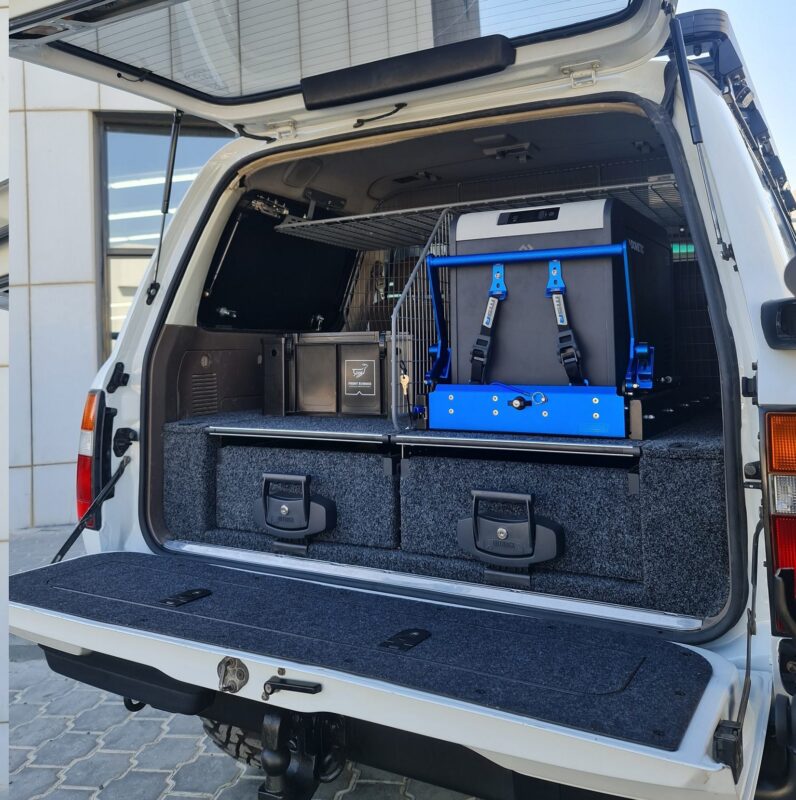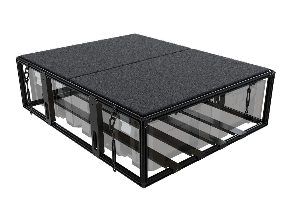 This convenient narrow storage solution means your vehicle can cleverly store 4 Wolf Pack Pro boxes in style. It’s been designed for interior vehicle use or in the covered load bed of a pick-up and takes only minutes to install, and then you can easily slide your storage boxes in and out. The carpeted deck holds up to 80kg and is perfect for fridge/cargo slides.