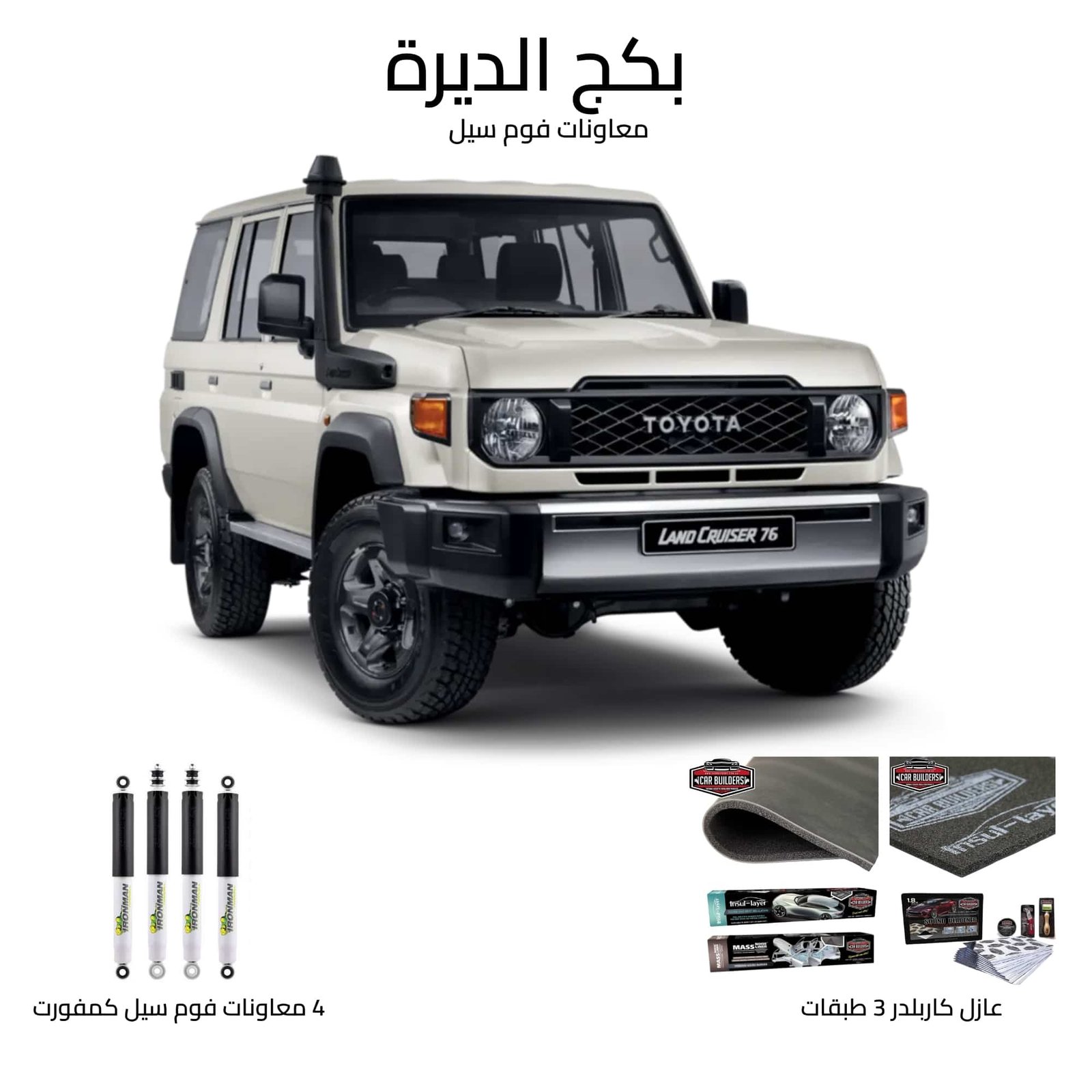 Upgrade your vehicle’s comfort and off-road performance with the Al Deira Package, a complete solution designed to improve both ride quality and cabin insulation. This package combines Ironman 4×4 Foam Cell shock absorbers with premium sound and heat insulation materials, creating a quieter, smoother, and more enjoyable driving experience on and off the road.