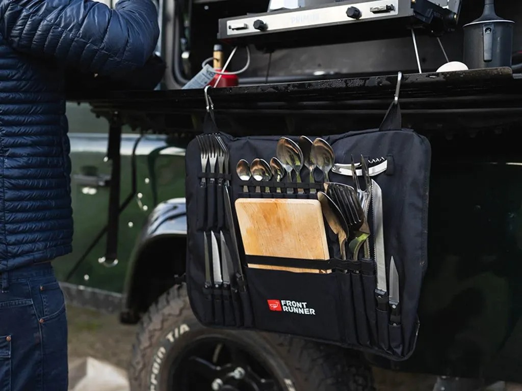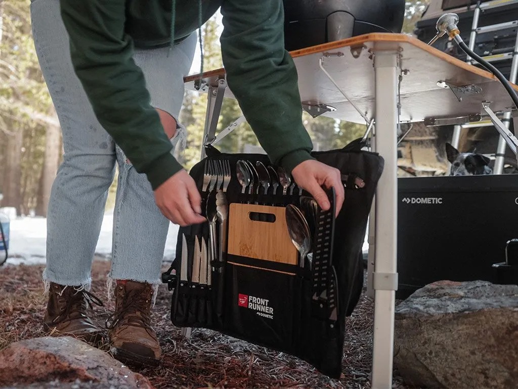 The entire kit fits in a custom tool-style roll with flap, featuring adjustable straps and buckles, and carrying handles. The utensils also features loops with carabiners so the opened utensil bag can be hung for quick and easy access.
