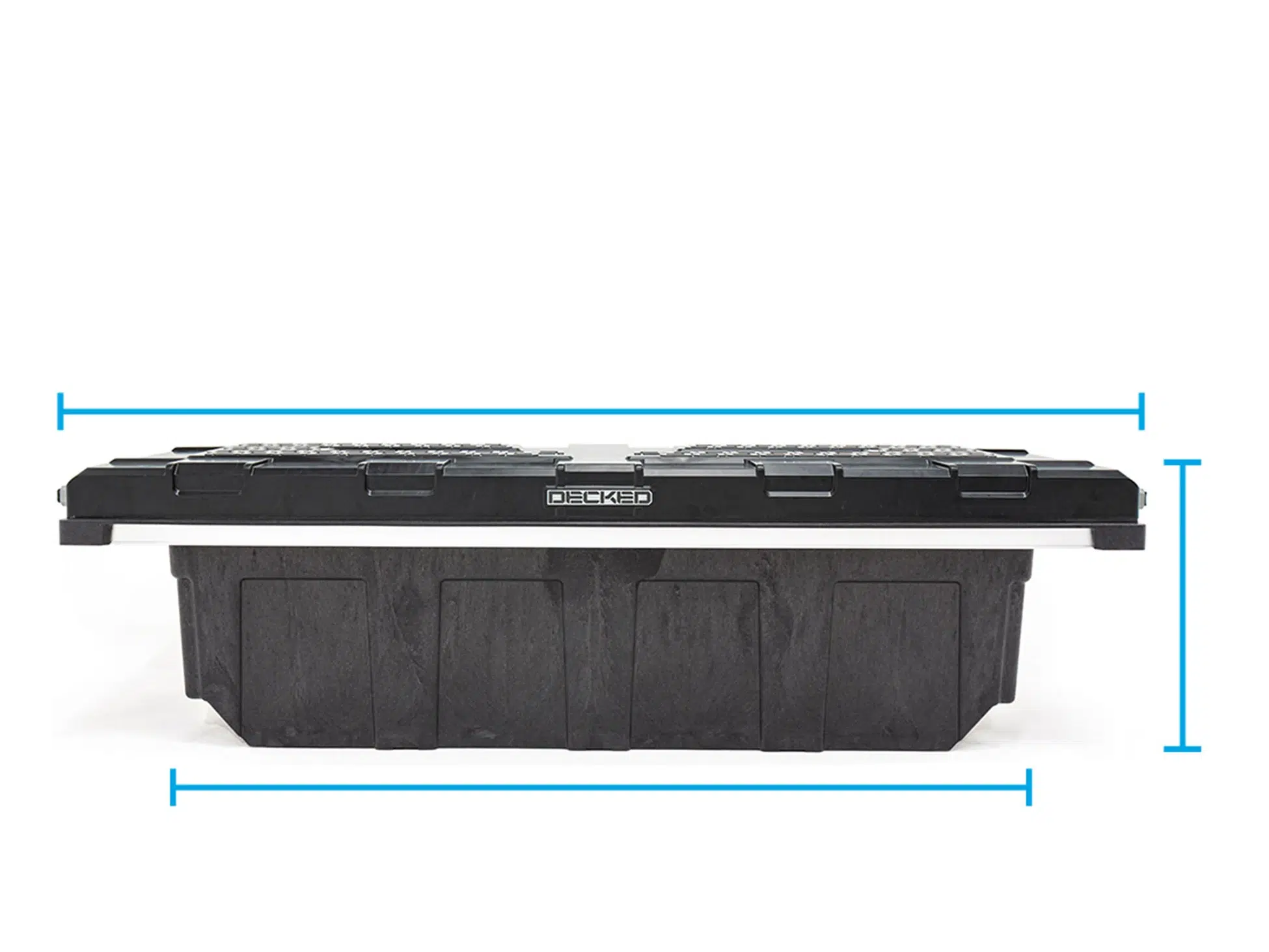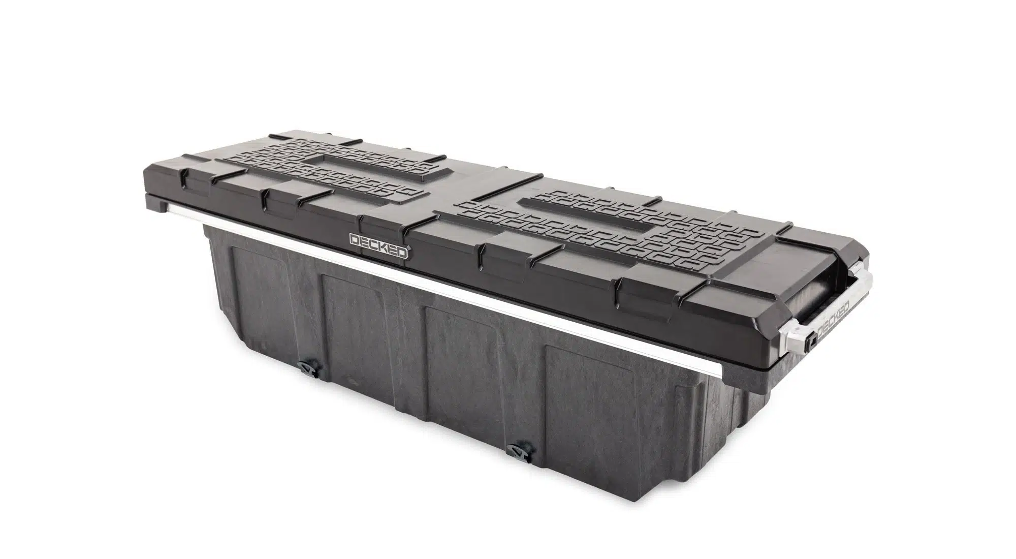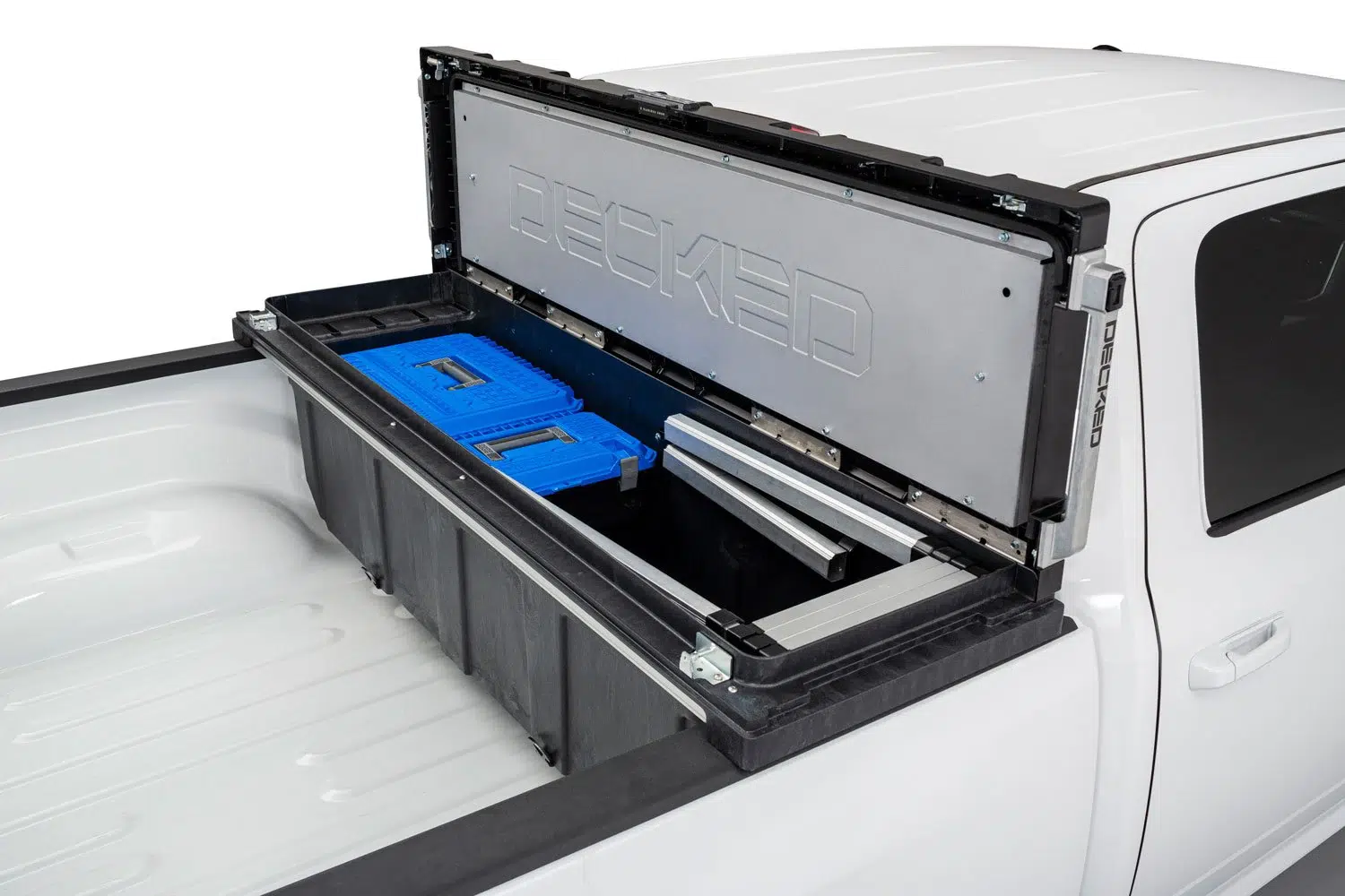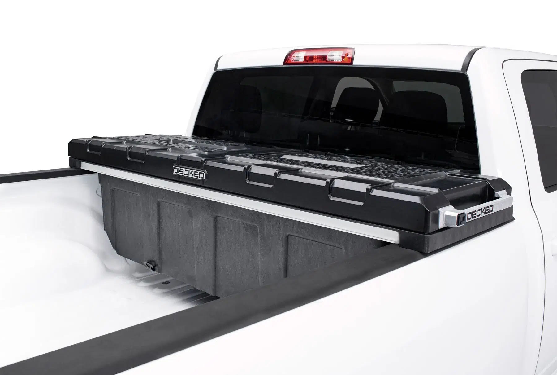 The DECKED Tool Box is constructed using injection molded, high-impact resin with galvanized steel and aluminum reinforcement. Robust steel armored locking mechanism combined with driver side lock makes forced entry nearly impossible. Comes with (2) keys.