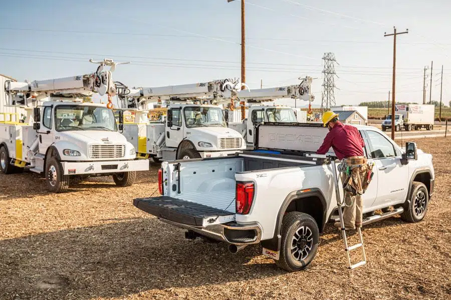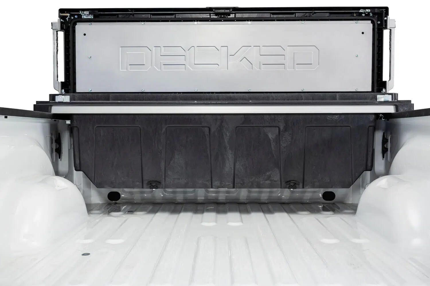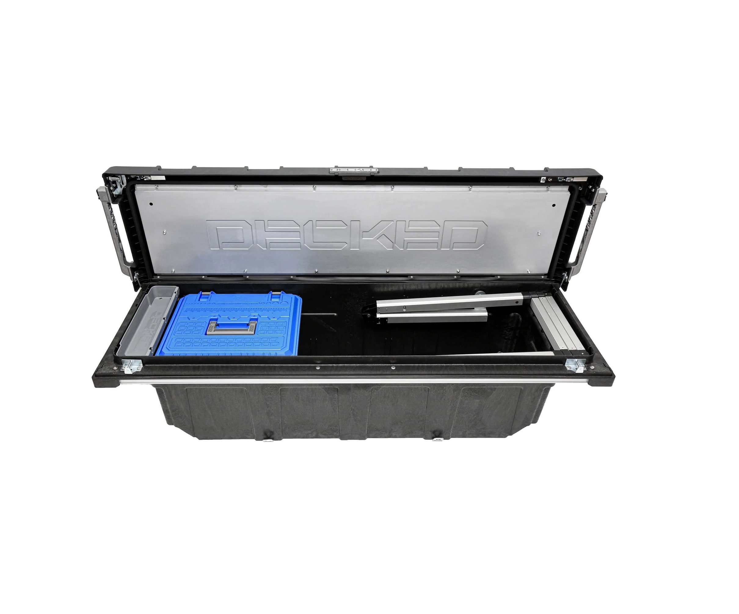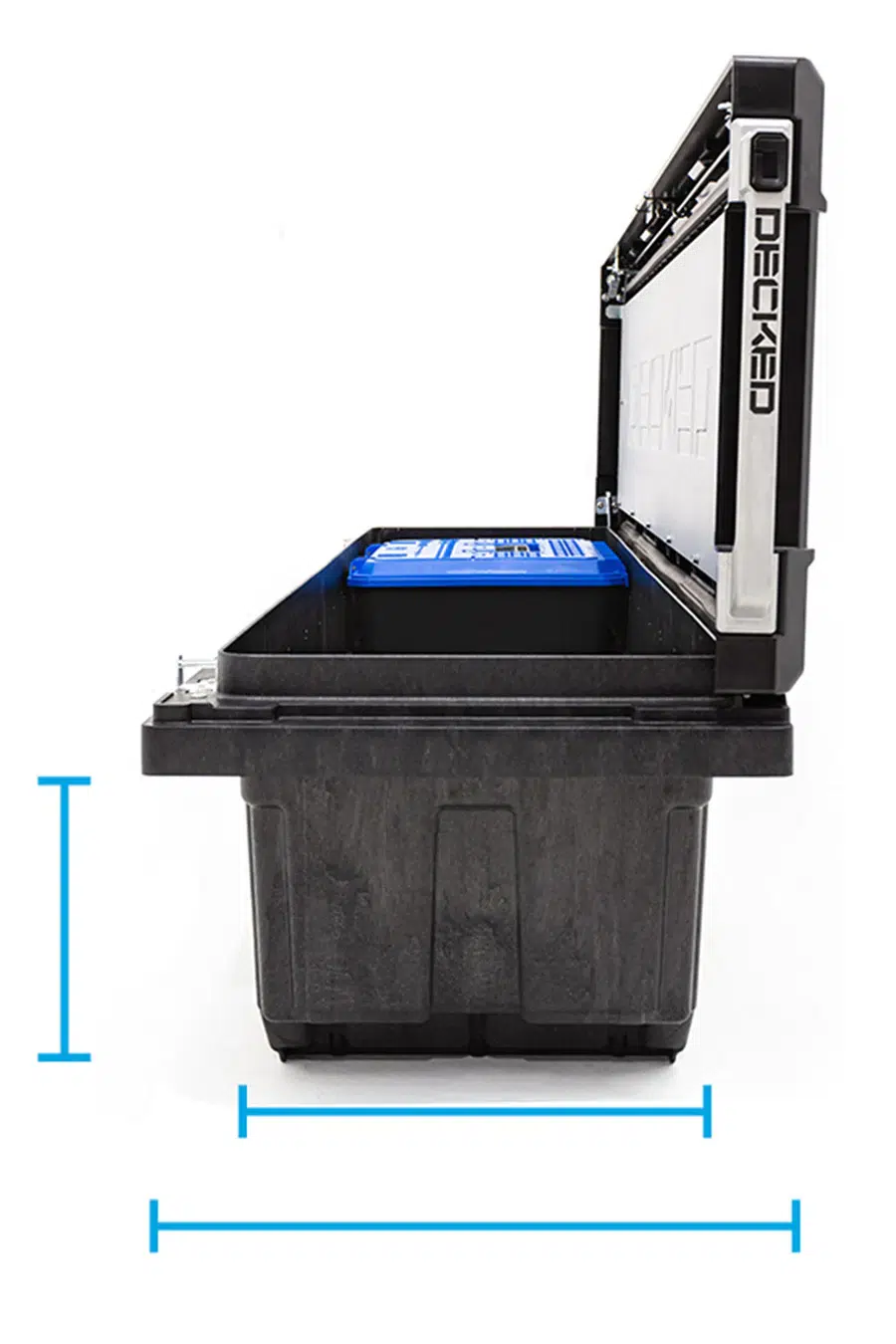 The DECKED Tool Box is constructed using injection molded, high-impact resin with galvanized steel and aluminum reinforcement. Robust steel armored locking mechanism combined with driver side lock makes forced entry nearly impossible. Comes with (2) keys.