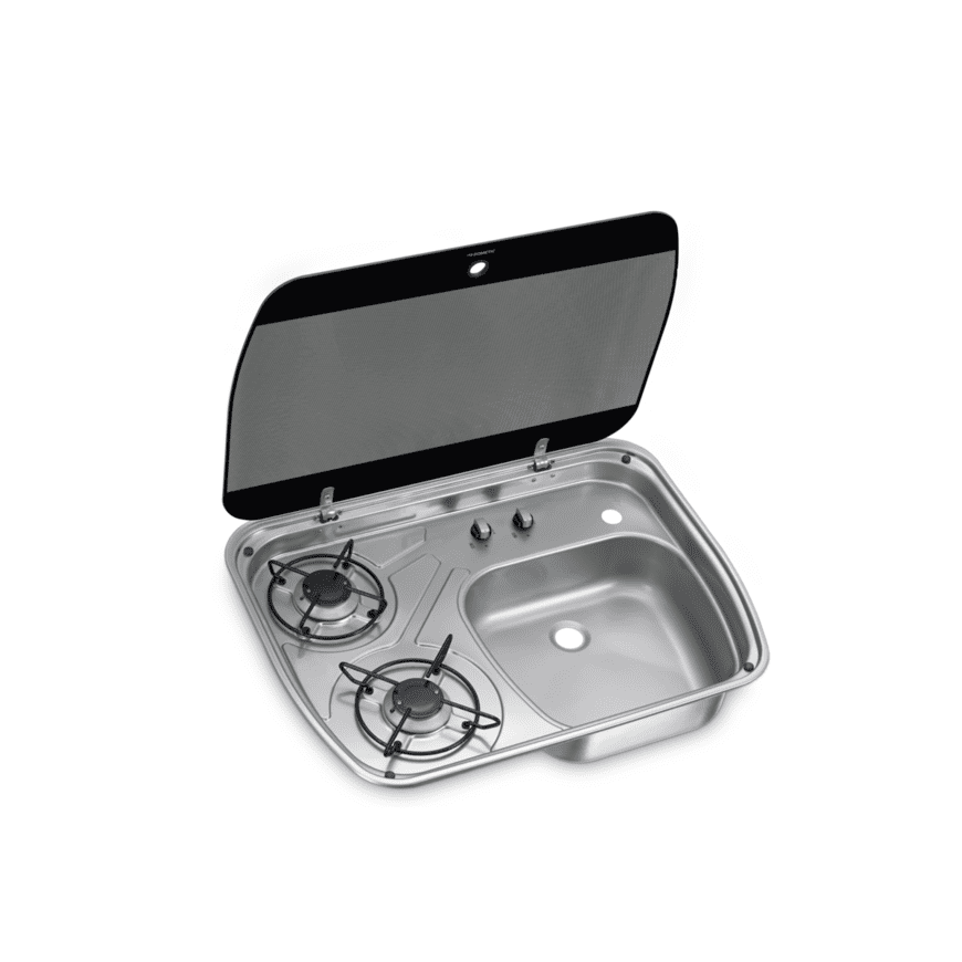 The compact Dometic HSG 2445 is a convenient two-burner hob and sink combination for motorhomes and caravans that fits neatly into the kitchen area without taking up lots of valuable space. Maximising the space still further, a heat-resistant safety glass lid can be used as additional work space when closed. For ease of cleaning the chrome pan supports can be detached.
