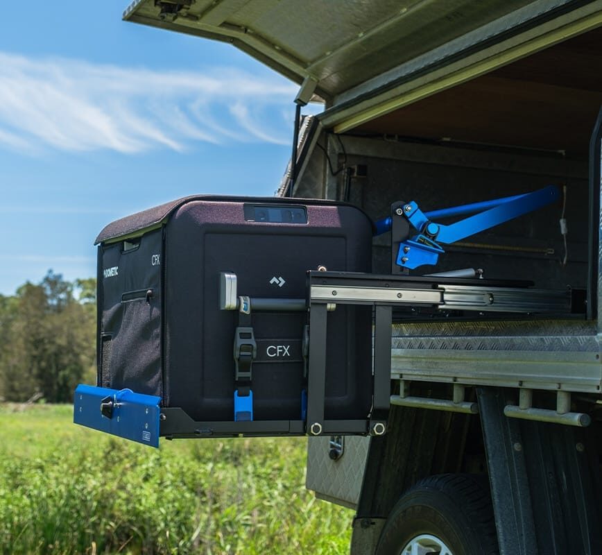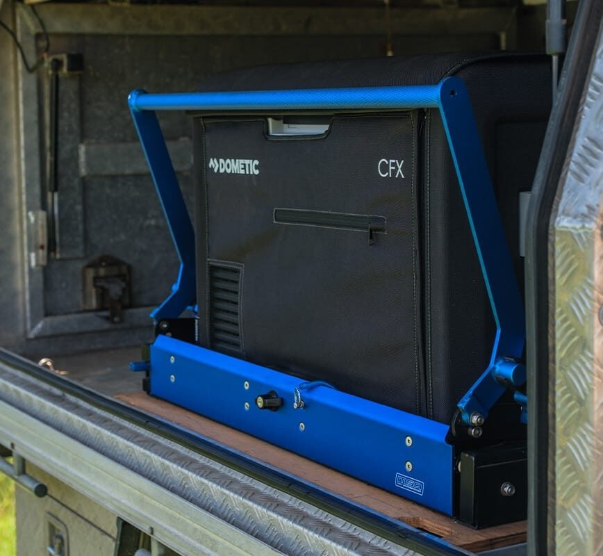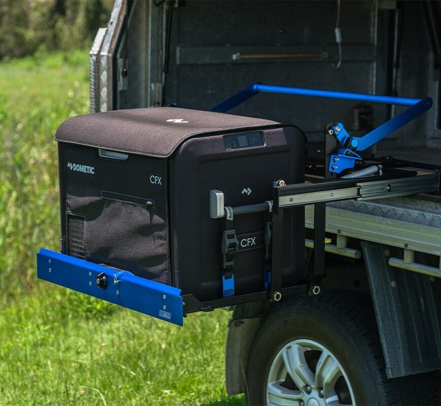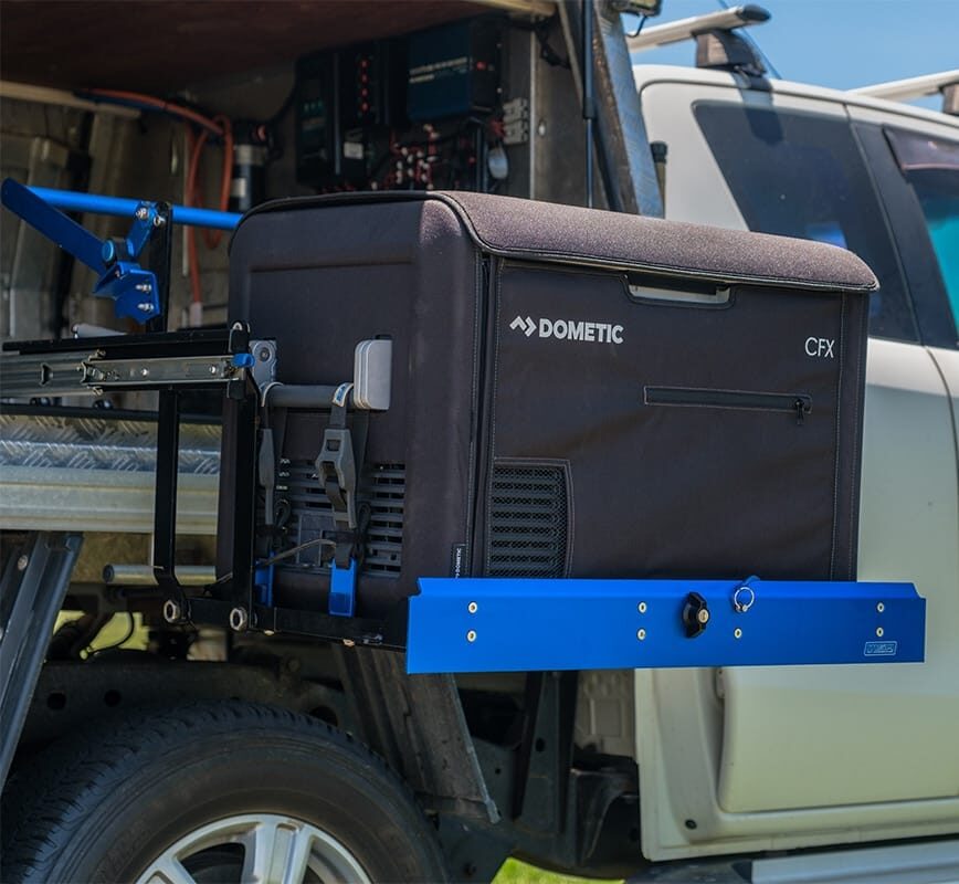 A blue anodised faceplate creates a tough, durable and easily recognisable feature, that is unique to all MSA 4X4 Slides. The frame is constructed from powder-coated steel and the compact design maximises storage space within the vehicle. The MSA 4X4 Side Drop Slideâ„¢ is engineered to be easily installed and the pre-drilled tray holes provide anchor points for most popular fridges. The lock-in, lock-out safety feature locks the slide in its intended position while travelling, preventing potential damage to the fridge and vehicle.