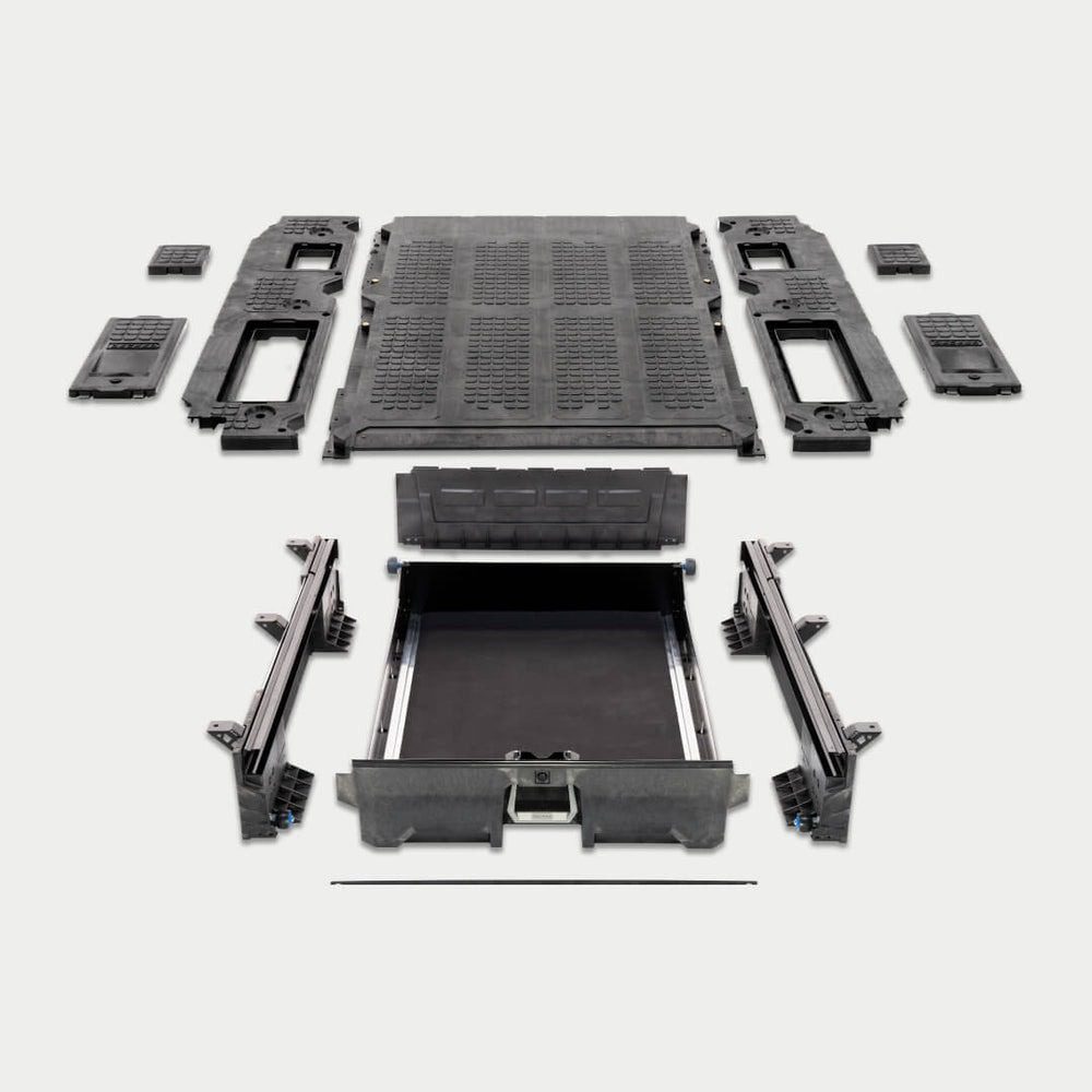 Featuring a highly adaptable single drawer with a massive 180 kg capacity, the DECKED midsize Drawer System combines weatherproof, lockable, ultra-secure storage with a 454 kg payload-rated, D-ring tie-down equipped deck for unparalleled versatility.