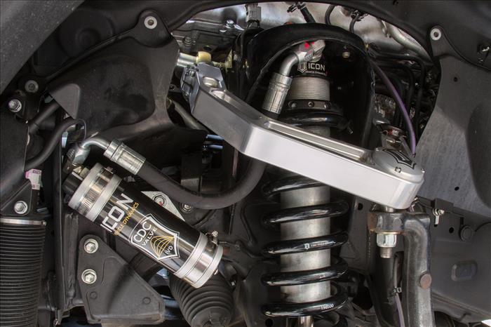 The ICON Vehicle Dynamics V.S. Series 2.5” remote reservoir coilover shocks w/ CDCV are an incredible upgrade for the front end of the 2008-Up Toyota Land Cruiser 200 Series. ICON’s Vehicle-specific valving provides a sport tuned feel on and off-road while offering 1.5-3.5” of lift height adjustability for use of larger, more aggressive wheel and tire combinations. ICON’s larger 2.5” shock body and increased piston area over stock components provides improved damping ability and outstanding ride characteristics across varying types of terrain. Remote reservoir ensure optimum performance by increasing the duration of consistent damping regardless of situation, keeping the shocks at a cooler operating temperature during heavy use. The ICON CDC Valve upgrade is included for those desiring an easy way to tune the ride externally with 10 settings from soft to hard. When paired with ICON rear 2.5 Series shocks, vehicle control will be balanced front to rear resulting in the best overall driving experience for your Land Cruiser 200 Series.