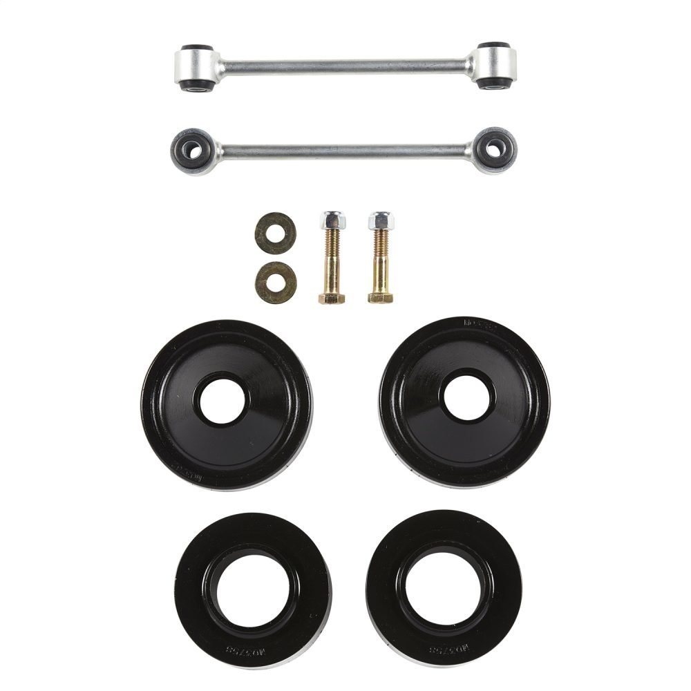 This kit includes poly coil spacers for the front rear, in addition to new sway bar end links. This 1.5″” economy leveling kit is quick and easy to install, and gives your JK a new stance to run larger tires and increase ground clearance, all while maintaining factory ride.