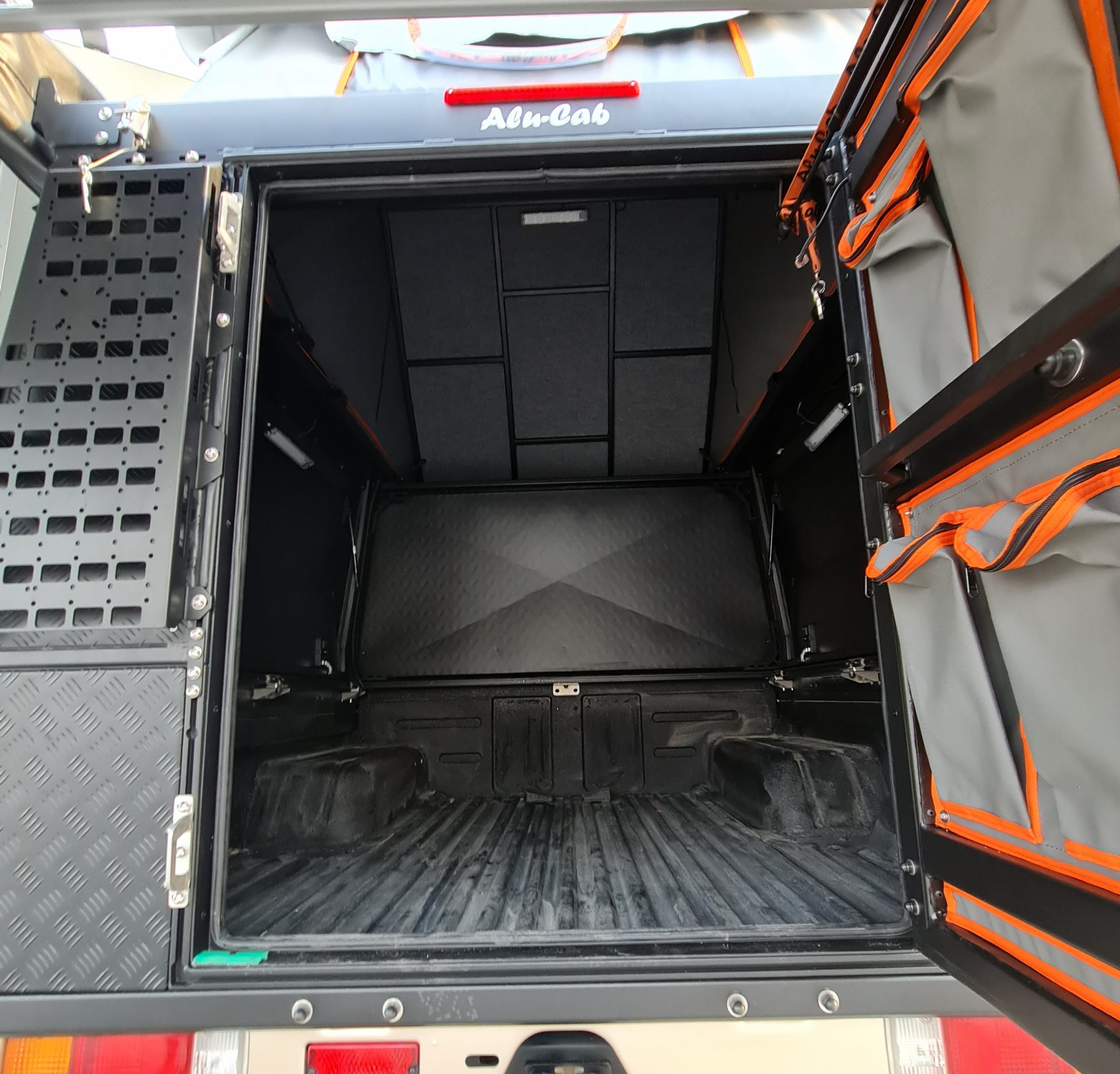 An easy-access vertical door with heavy-duty hinges, and the ability to mount a 33″ spare-wheel (No need for an after-market rear bumper and wheel carrier). This also solves the problem of dust entering through the tailgate.
