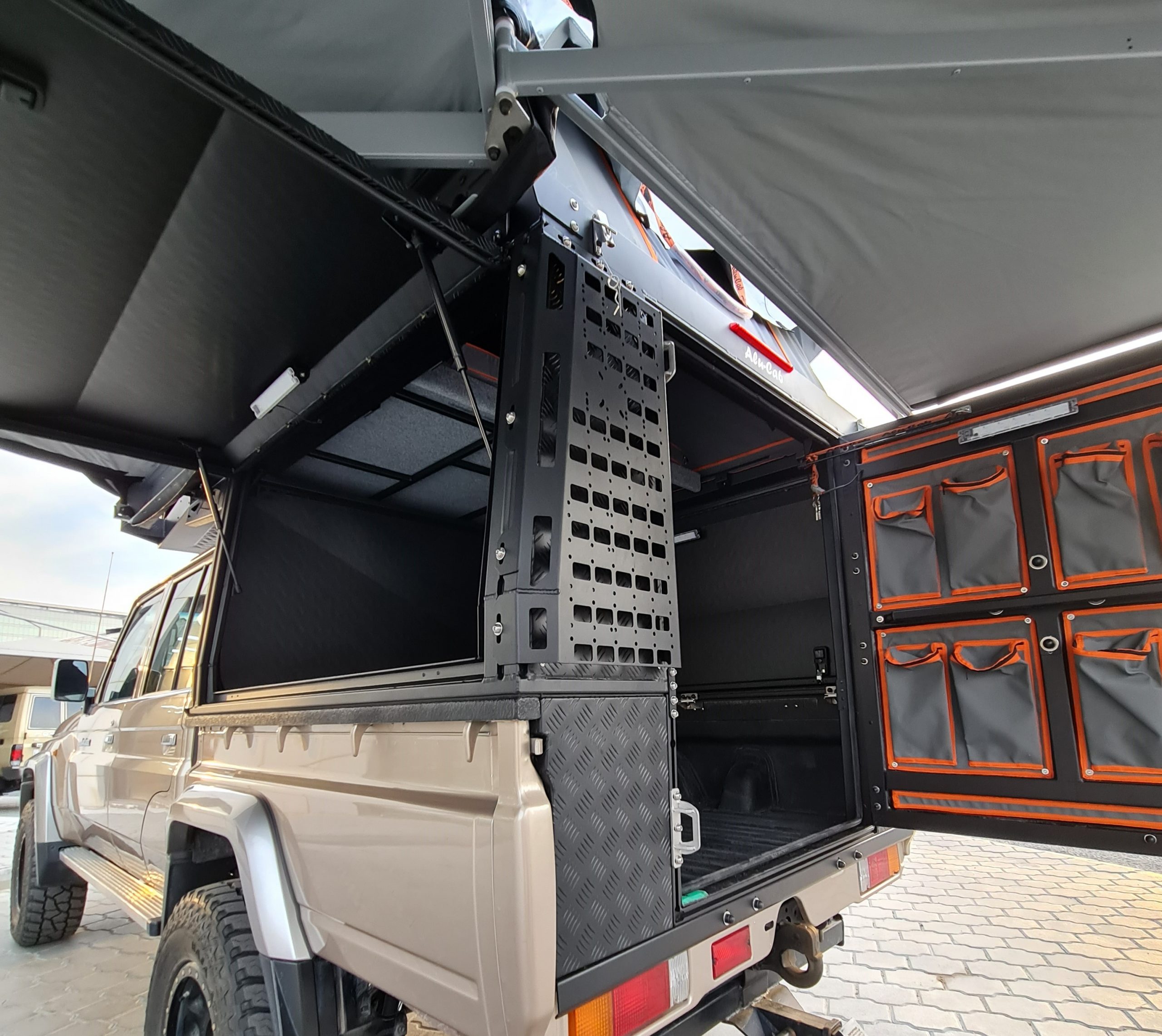 Canvas bags @ rear door and set of 2 Molle Plates PLUS Awning fitted (Including deflector)