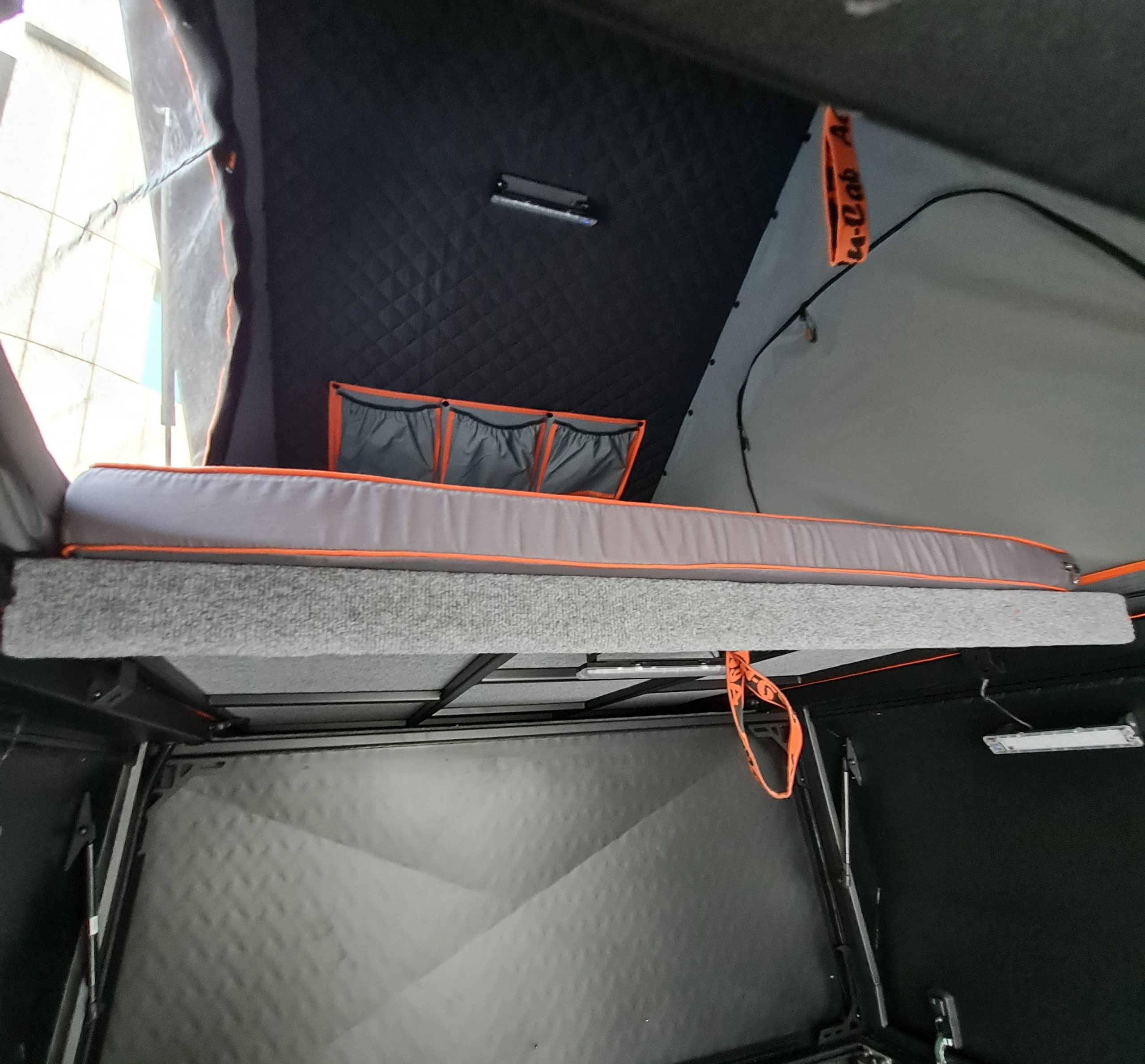 Main Unit of shoe bag on roof, one light in roof, one under bed, 3 at doors, 2 stalk lights, USB port and wiring for solar panel (excl solar panel).Canvas Mesh bags @ rear panels,