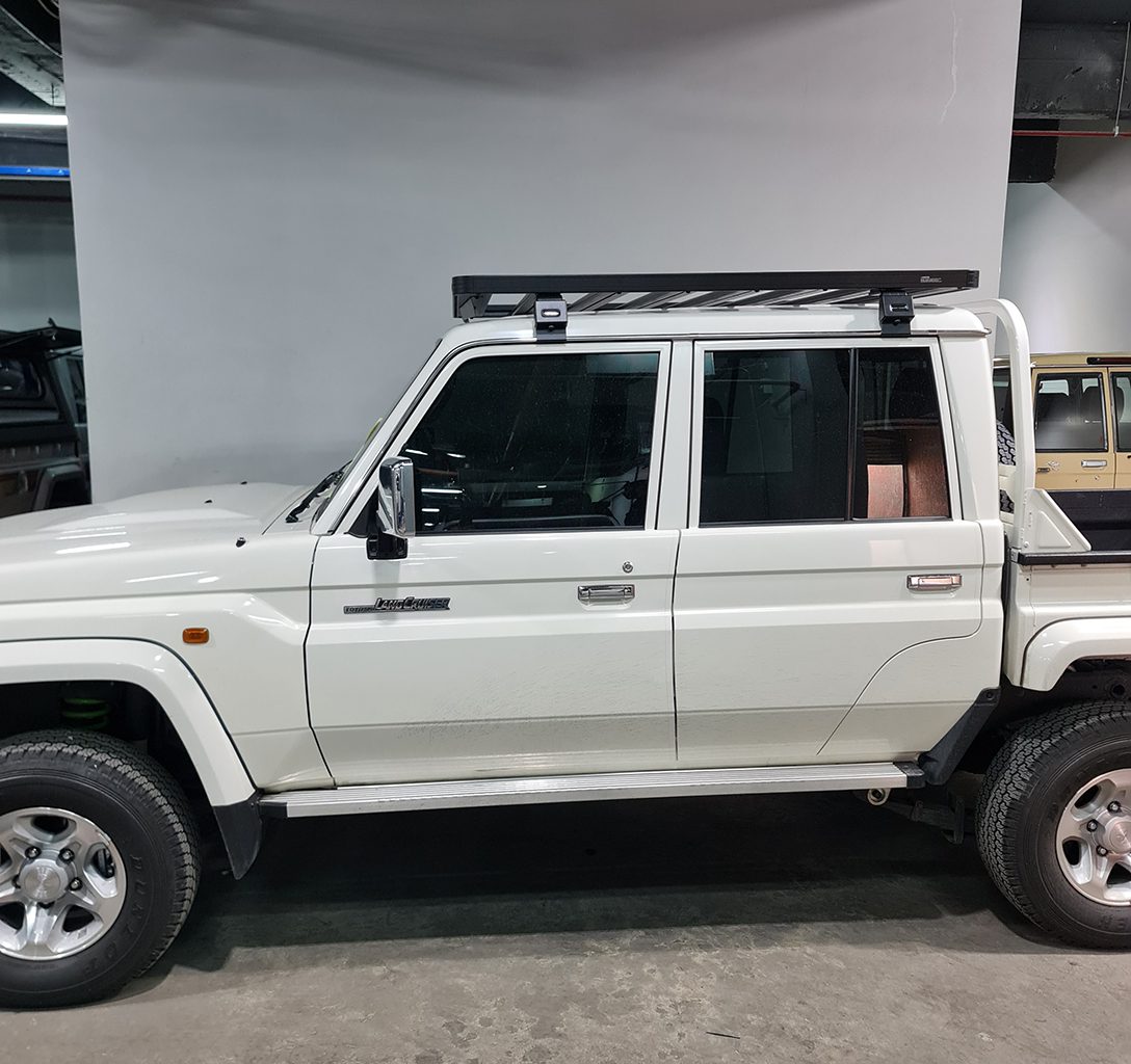This 1560mm/61.4″ long full-size Slimline II cargo carrying roof rack kit for the Toyota Land Cruisers lc79 DC contains Slimline II Tray and Wind Deflector, as well as 6 Gutter Mount legs for mounting the Tray to the vehicle. It installs easily with no drilling required.