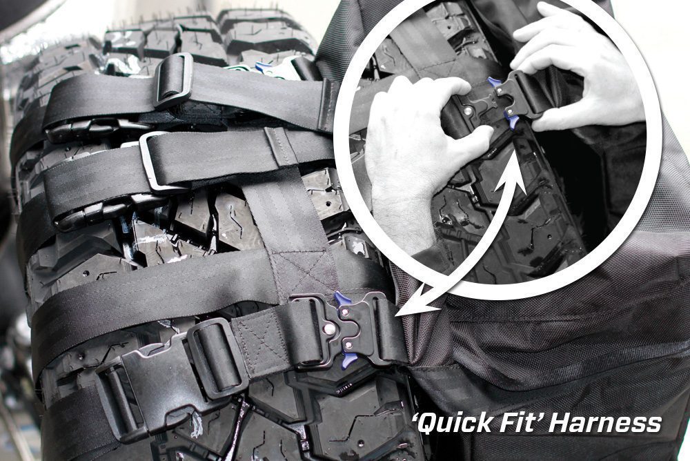 - Fully adjustable harness system that fits any tyre size