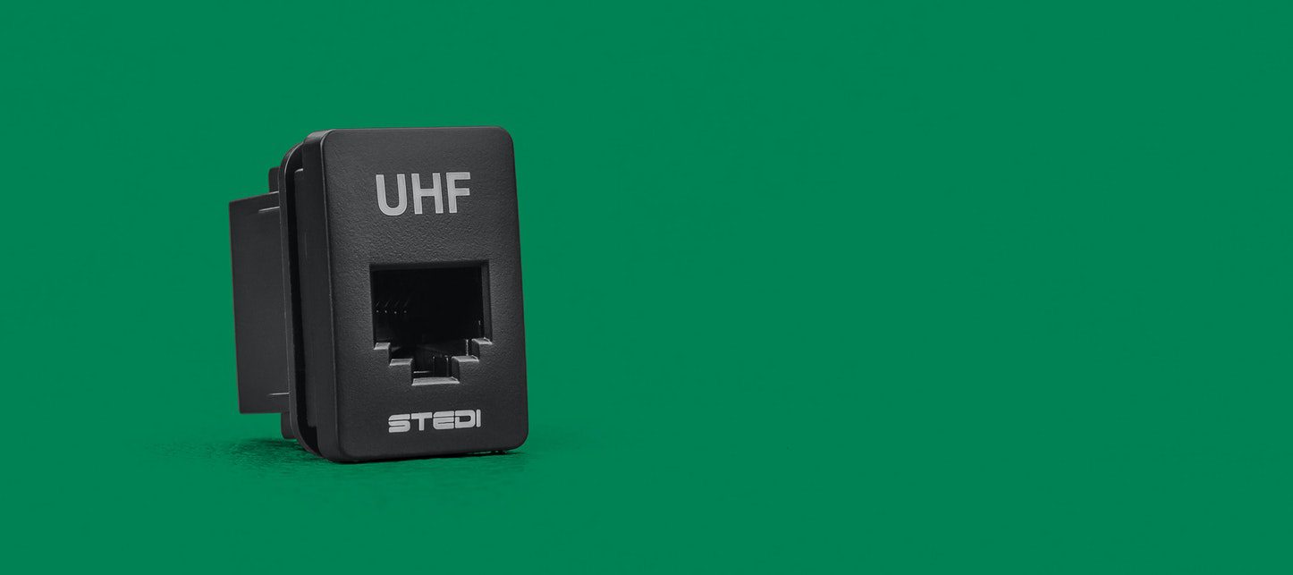 This RJ45 pass-through connector allows for a UHF fitted with an RJ45 connector to be plugged in.