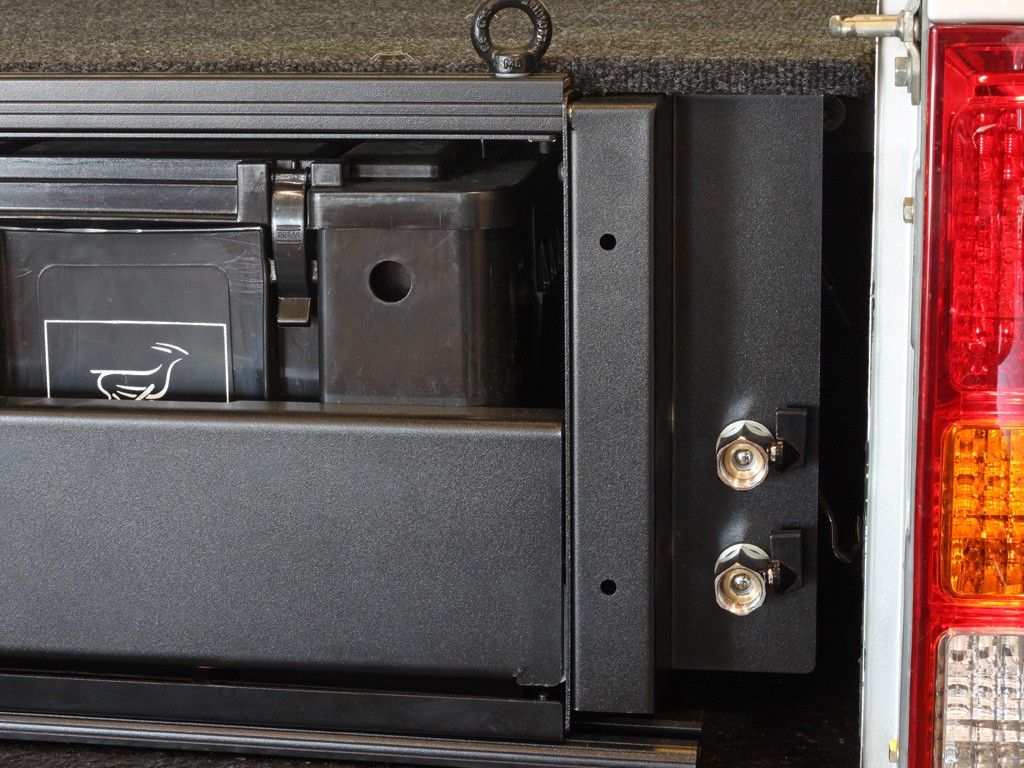 A 52L stainless steel water tank that fits behind the Front Runner Pickup drawer system. This water tank is positioned below the drawer deck to utilize the concealed space between the back of the drawer and the vehicle to preserve needed cargo space. Includes a 12V pump.