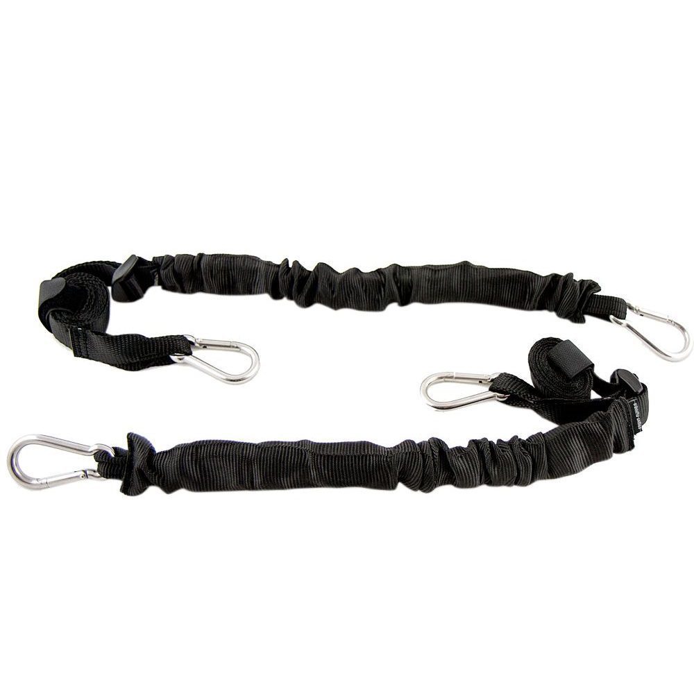 Adjustable from 22″ (560mm) to 63″ (1524mm) from the hook end of the carabiners. With up to an additional 8” of length when stretched.