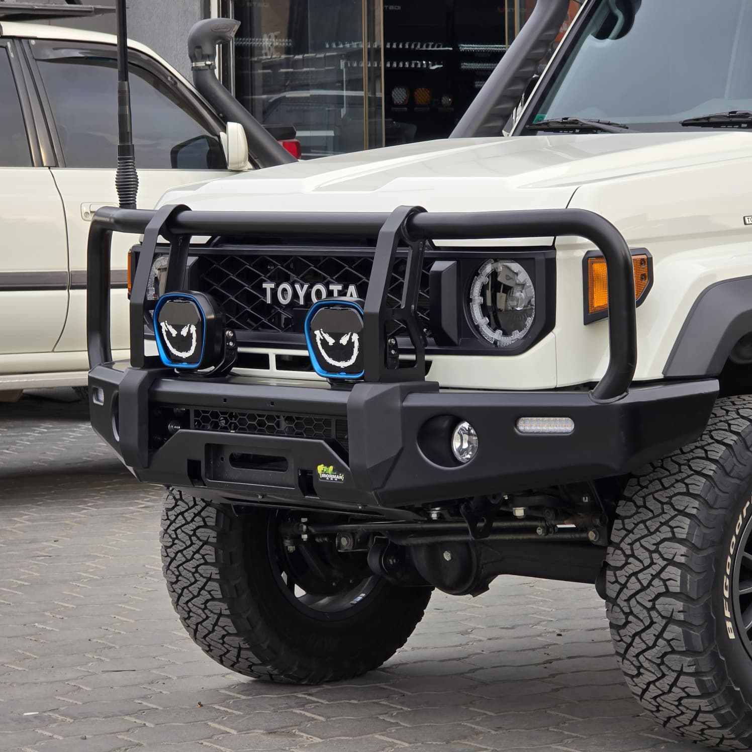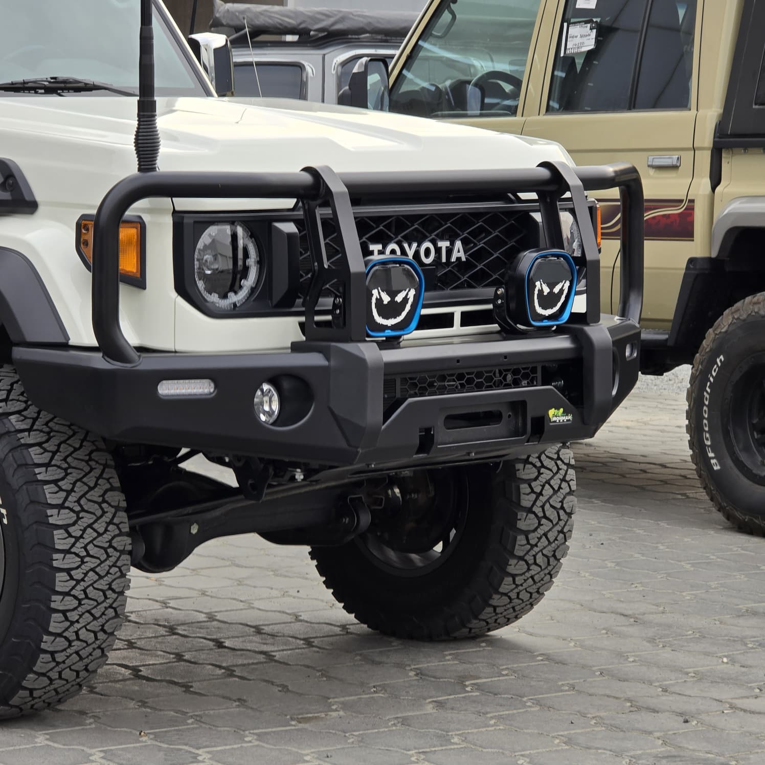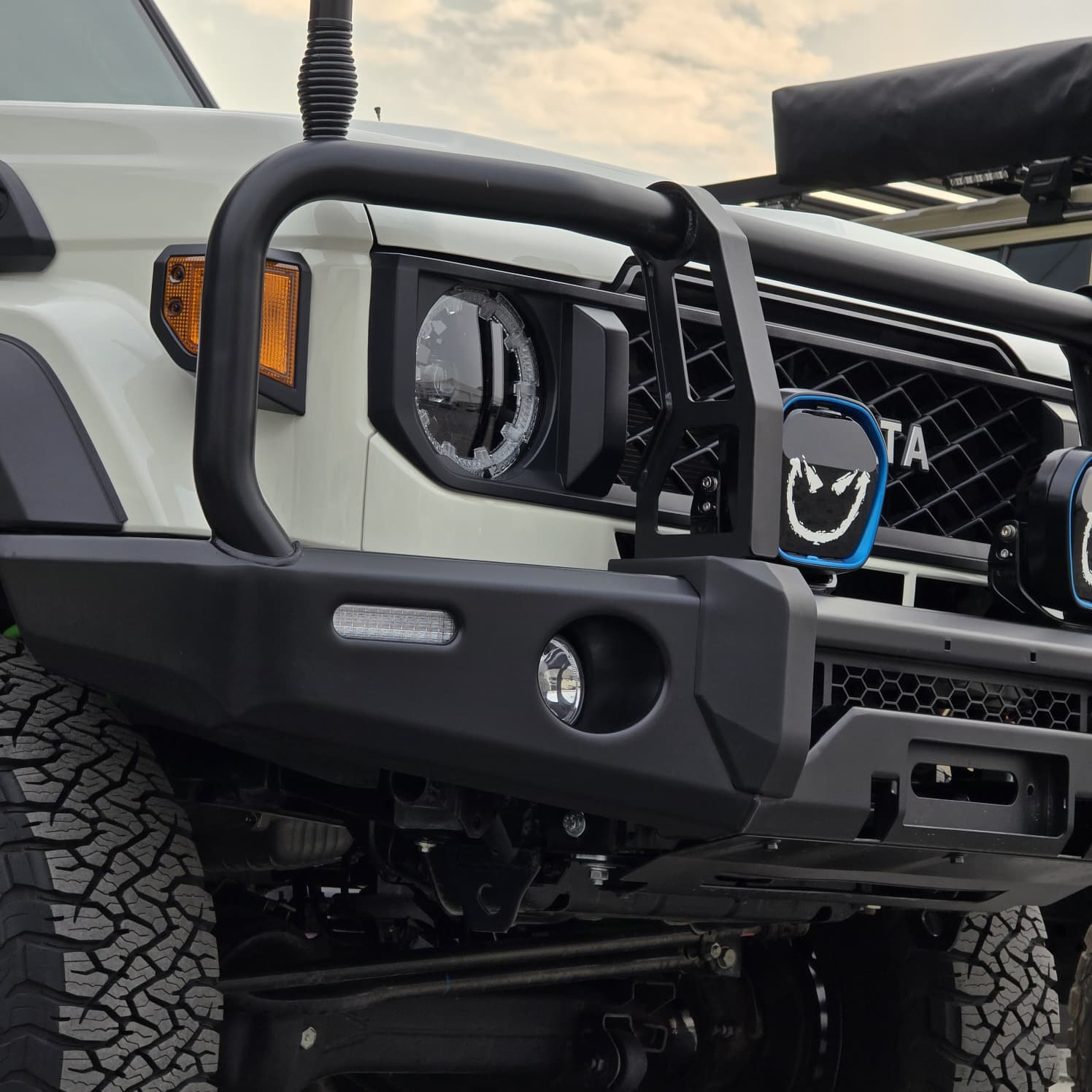 SRS airbag tested and certified, they are winch compatible and are completed with centered upper bar light bar mounts and standard aerial mount. Full steel construction including light pod surround, finished with a durable black powder-coated finish.