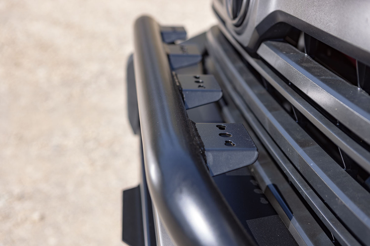BETTER OFF-ROAD PERFORMANCE: Elevate your off-road experience with Premium Single Hoop Front Bumpers, offering increased approach and departure angles for conquering any obstacles, better vehicle protection, and still being fully compatible with all proximity sensors and cameras. The included front rock guard helps deflect rocks and debris on the pavement or on gravel backcountry roads.
