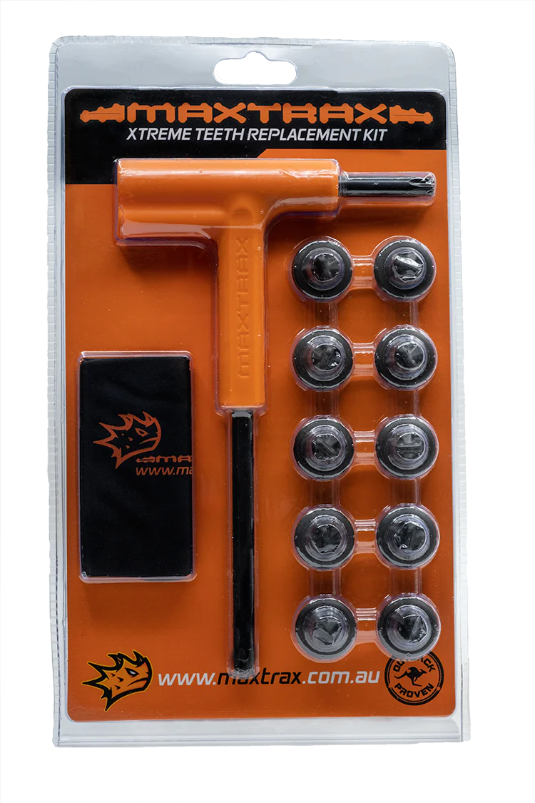 The MAXTRAX XTREME TEEH REPLACEMENT KIT includes 10 anodised alloy teeth to suit MAXTRAX X Series 4WD Recovery Tracks (not compatible with MAXTRAX MKII), plus a MAXTRAX XTRACT INSERT TOOL and a soft bag to store the replacement teeth. All the teeth on the MAXTRAX X Series 4WD Recovery Tracks are the same shape and size, so you can replace any damaged tooth with any of these replacement teeth; a quick and easy task using MAXTRAX XTRACT INSERT TOOL.